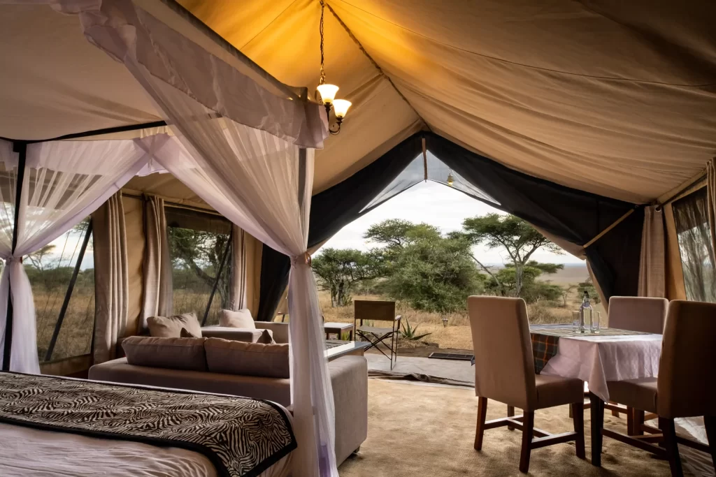 Karibu Camps and Lodges offers a special experience called Woodlands Camp, which is available from December to March. It’s a luxurious mobile tented camp located in Nabi Slopes, near Lake Ndutu, Moru Kopjes, and the Hidden Valley. The camp is set up during the calving season, which is an emotional time when hundreds of baby calves are born in the Serengeti’s plains.