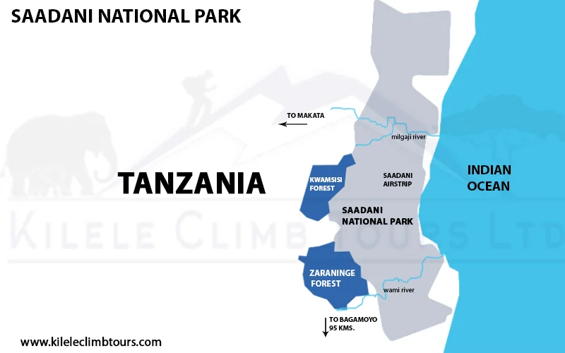 - On the Arusha – Dar es salaam road, off Mkata Junction via Kwamsisi to Madete Entrance Gate 79km from Mkata to Madete.