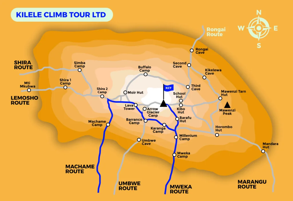 The route approaches Mount Kilimanjaro from the south, beginning with a short drive from Moshi to Machame Gate. The path then leads hikers through the rainforest to the Shira Plateau, where numerous routes to Kilimanjaro converge. Subsequently, the route veers towards the east and passes beneath Kilimanjaro’s Southern Ice Field on the Southern Circuit path before ascending to the summit from Barafu. The descent is then made via the Mweka route.